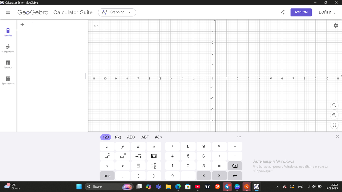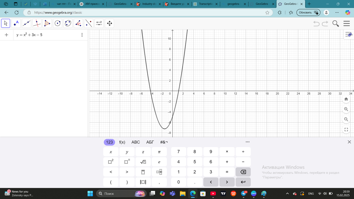 Tenglamani kiriting (masalan, y = x^2 + 3x - 5). Grafik avtomatik ravishda ish maydonida ko'rsatiladi. Tahlil vositalaridan foydalaning (kesishish nuqtalari, tangenslar).