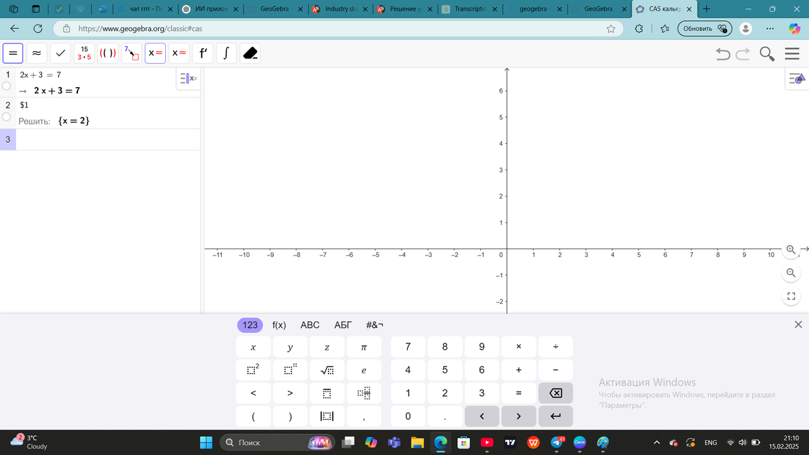 Tenglamani kiriting (masalan, 2x + 3 = 7). Enter tugmasini bosing-GeoGebra avtomatik ravishda yechim topadi.