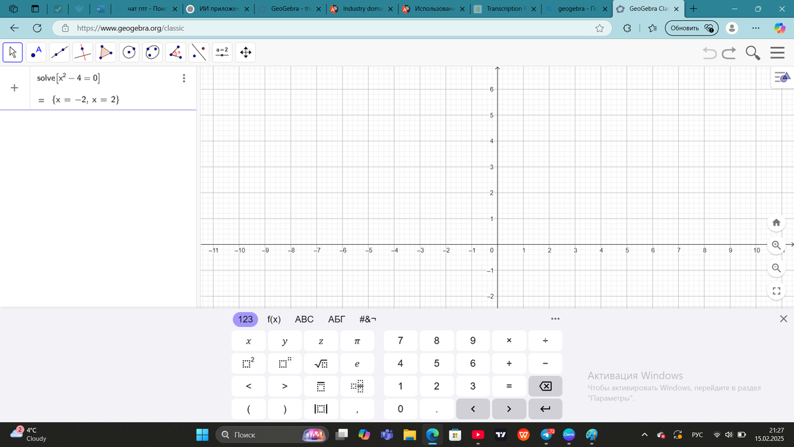 GeoGebra buyruqlarni qo'llab-quvvatlaydi, masalan: Solve [x^2 - 4 = 0] — tenglamani echadi.