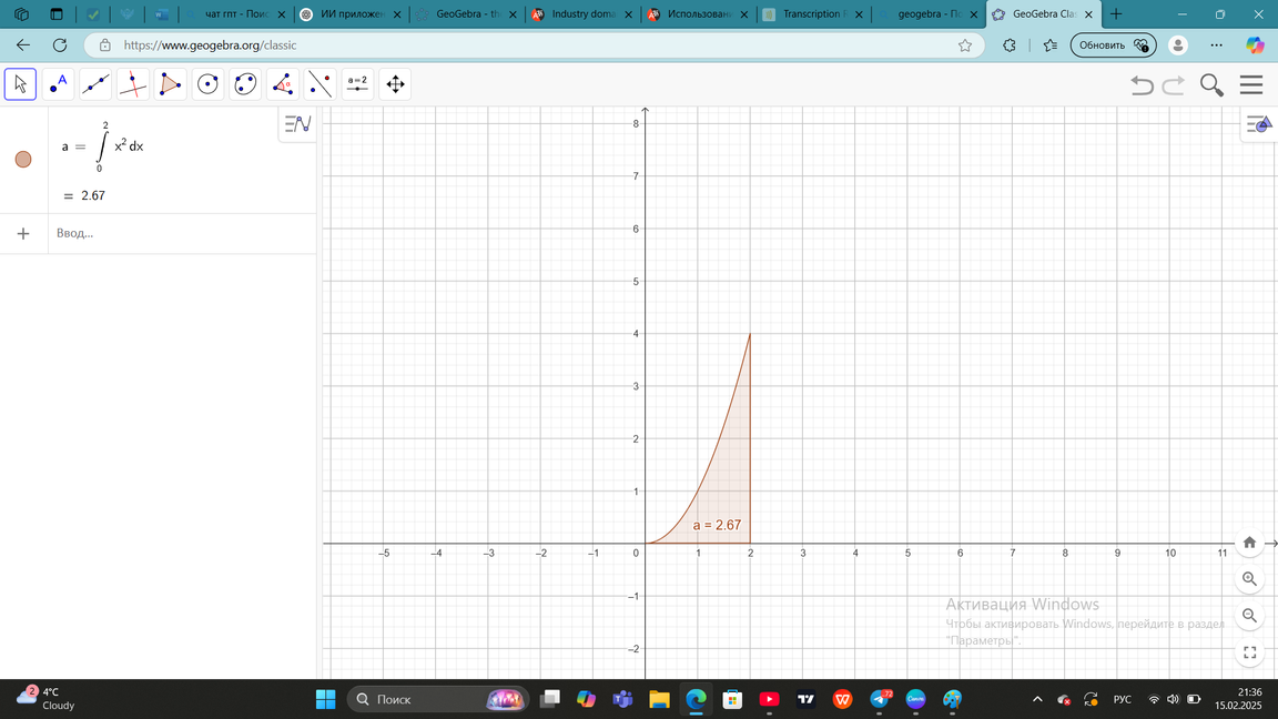 Integral [x^2, 0, 2] — ma'lum bir integralni hisoblab chiqadi.